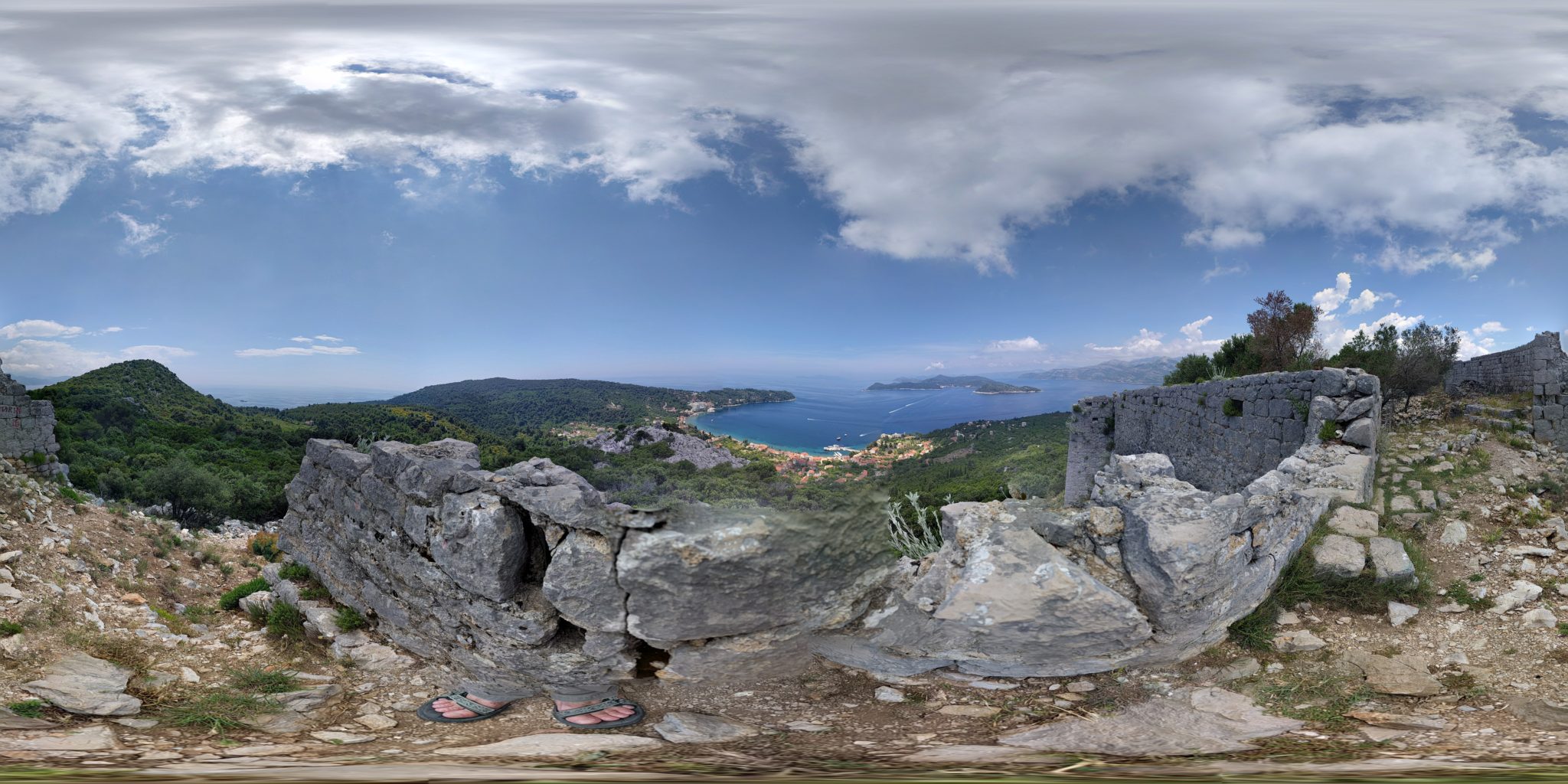 Von dort biegt Ihr in etwa auf der Höhe der Touristeninformation ein und folgt jenem Weg, der auf der Karte gelb markiert ist – so gelangt Ihr auf jeden Fall zu den sehenswerten kleine Kirchen und zu jener verlassenen Burg, in dessen Ruinen nun Ziegen gemächlich grasen. Von den alten Gemäuern aus habt Ihr einen wundervollen Blick über die Insel, wie Euch das folgende 360-Grad-Foto zeigt.