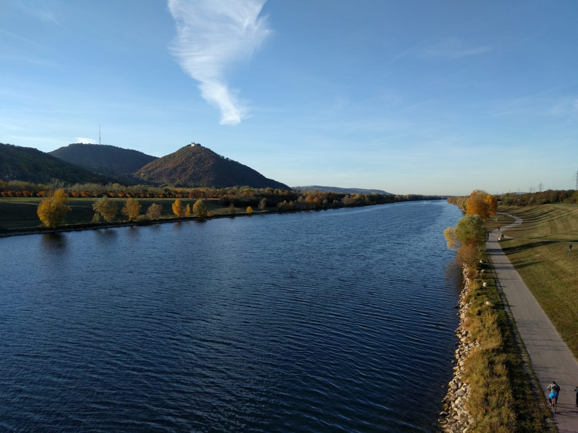 Danach geht es wieder durch etwas städtischeres Gebiet, vorbei am urbanen Teil des Marchfeldkanals. Irgendwann erreichen wir die Donau, die wir queren – mentale Folter an dieser Stelle ist, dass das Ziel der viertägigen Wanderung schon bald in Sichtweite ist, sich aber auf der anderen Seite der Donau befindet. Erst nachdem wir den Fluss an der Nordbrücke überquert haben, können wir uns unserem Ziel – dem Bahnhof Nussdorf – wieder nähern.